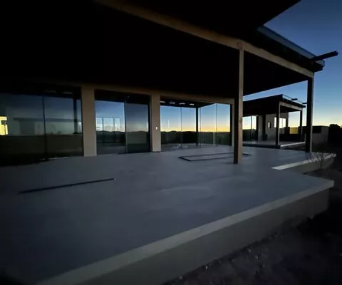 The expansive glass provides breathtaking, unobstructed views of the surrounding landscape, seamlessly blending the outdoors with the indoor living spaces.
