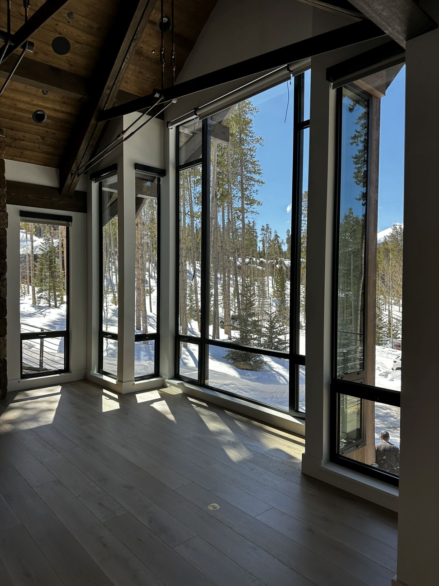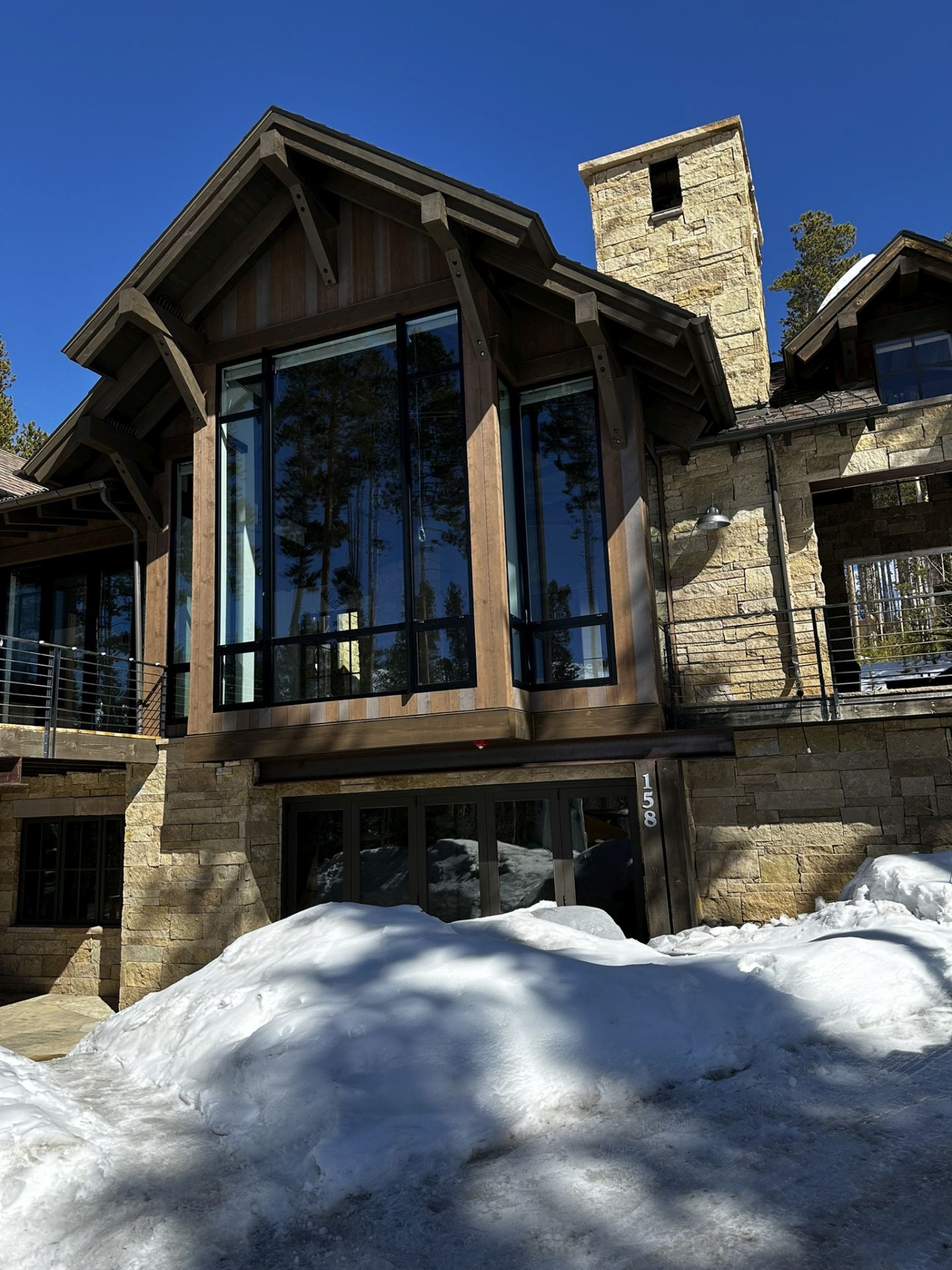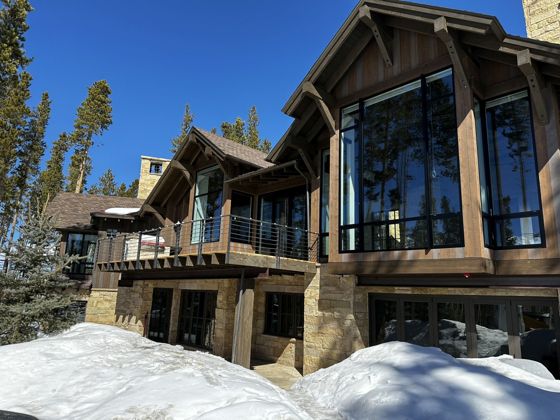 A showcase of a home in the mountains of Colorado that features oversized windows and doors, designed with strength and resilience to withstand high wind loads.
