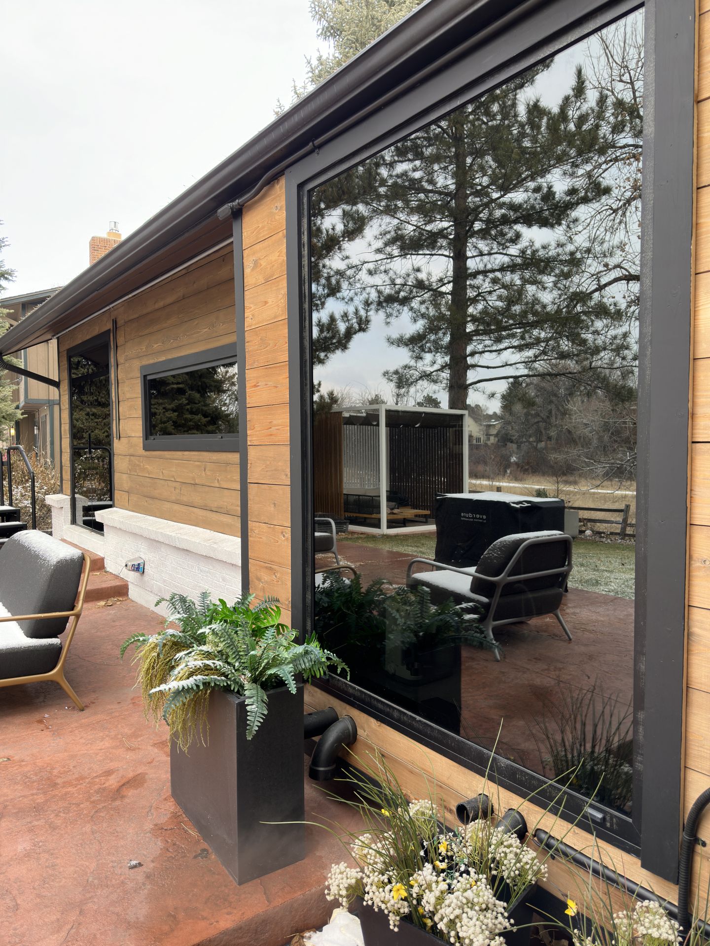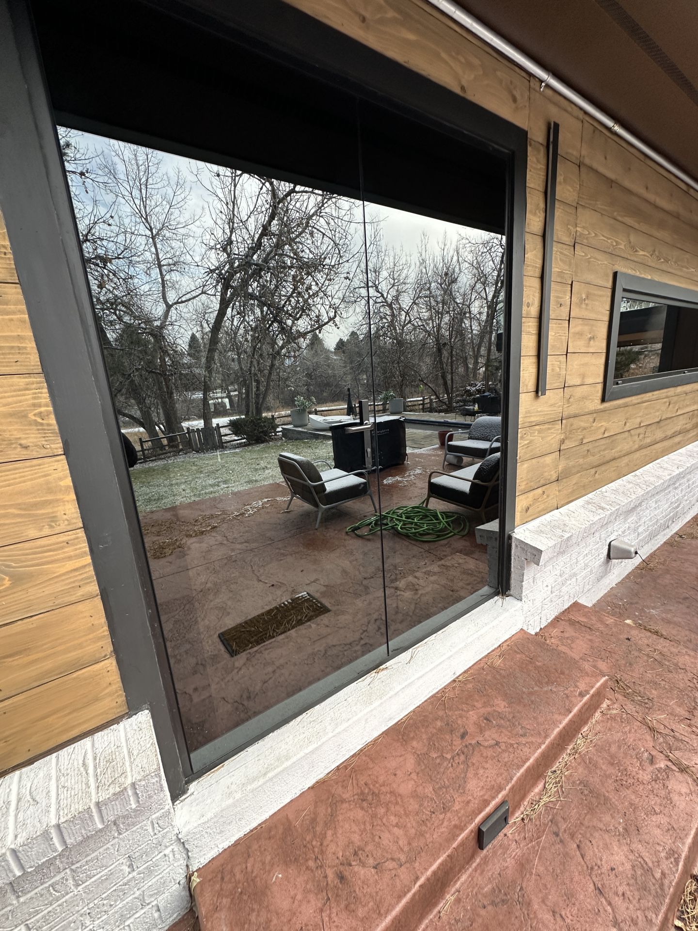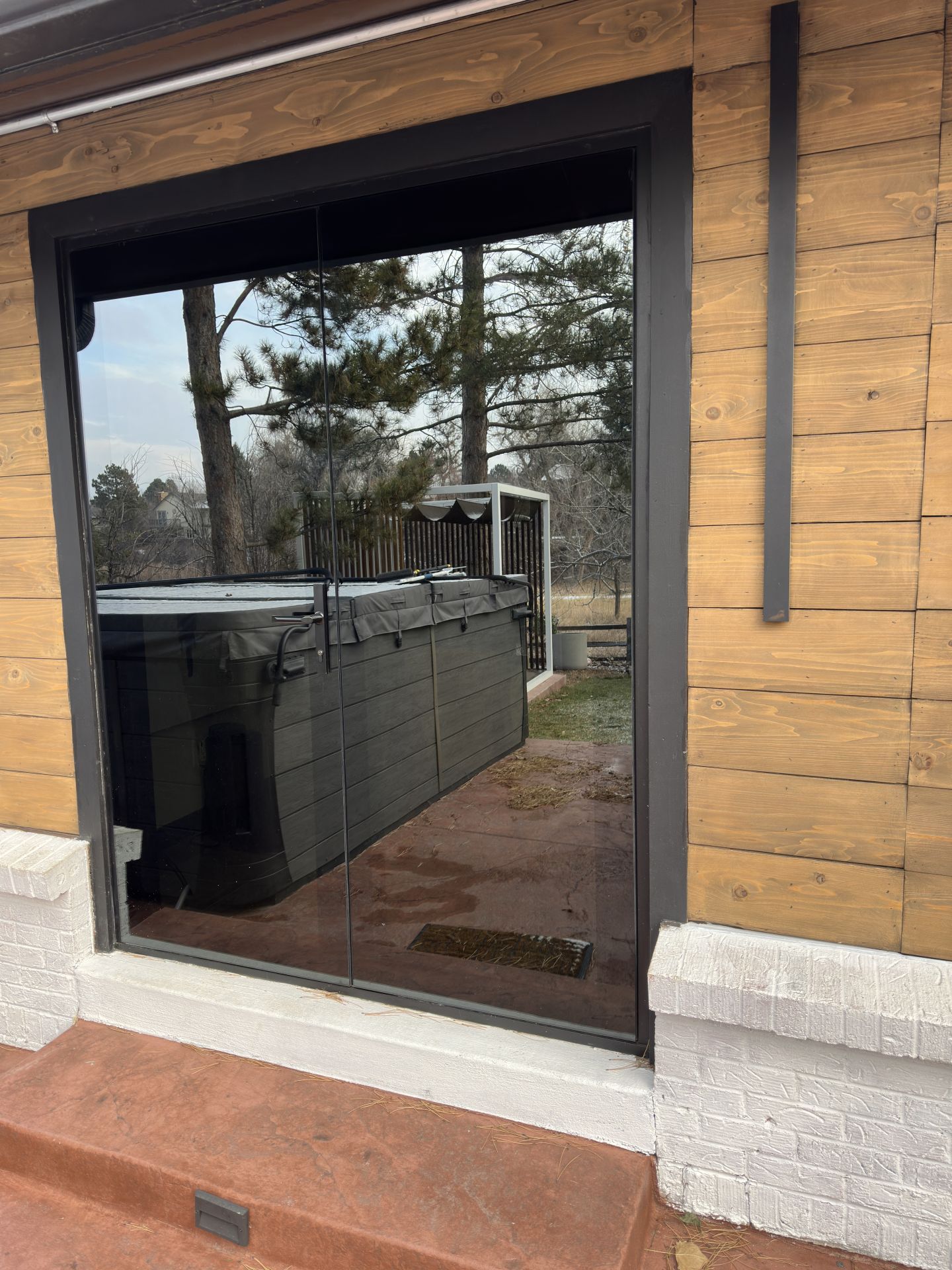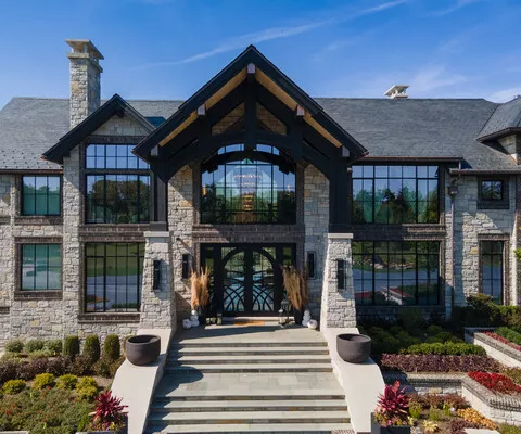 This privacy glass ensures that, whether day or night, the interior remains hidden from view while the glass mirrors its scenic surroundings. The customized entry door, with its paneled design, seamlessly blends into the home's architecture and enhances the rustic charm of country mountain living.