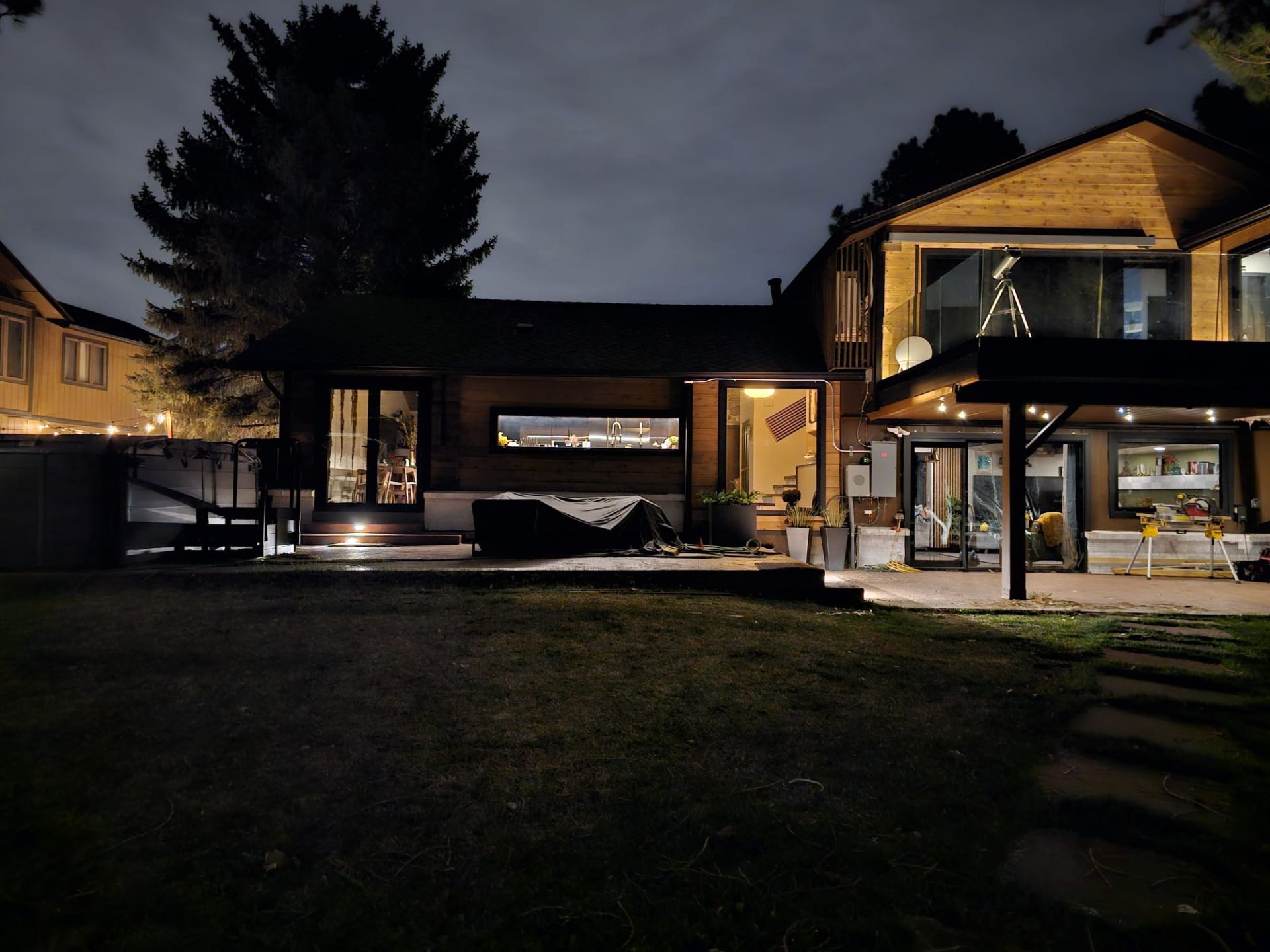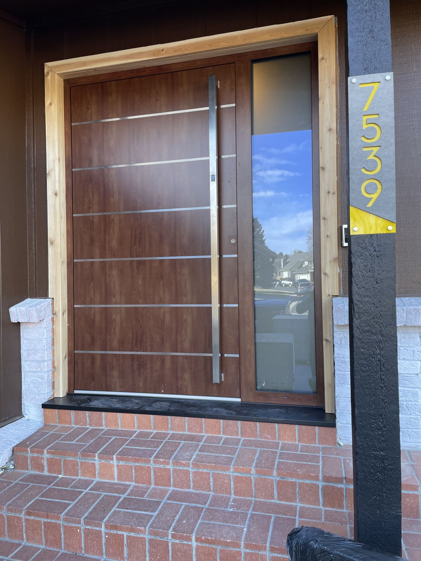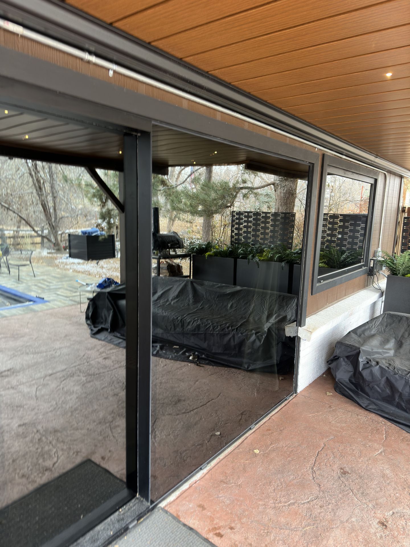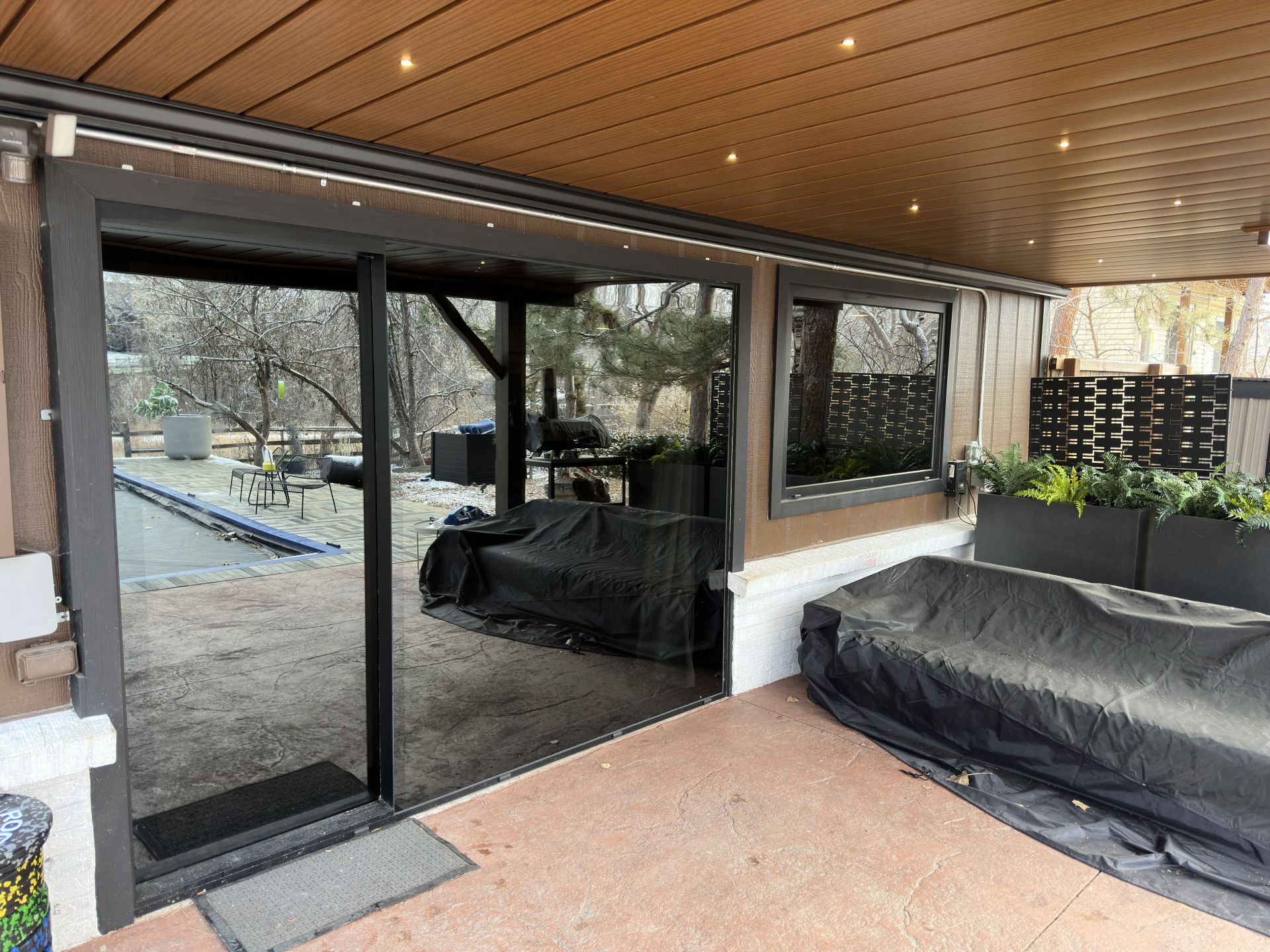 This privacy glass ensures that, whether day or night, the interior remains hidden from view while the glass mirrors its scenic surroundings. The customized entry door, with its paneled design, seamlessly blends into the home's architecture and enhances the rustic charm of country mountain living.