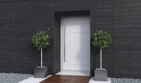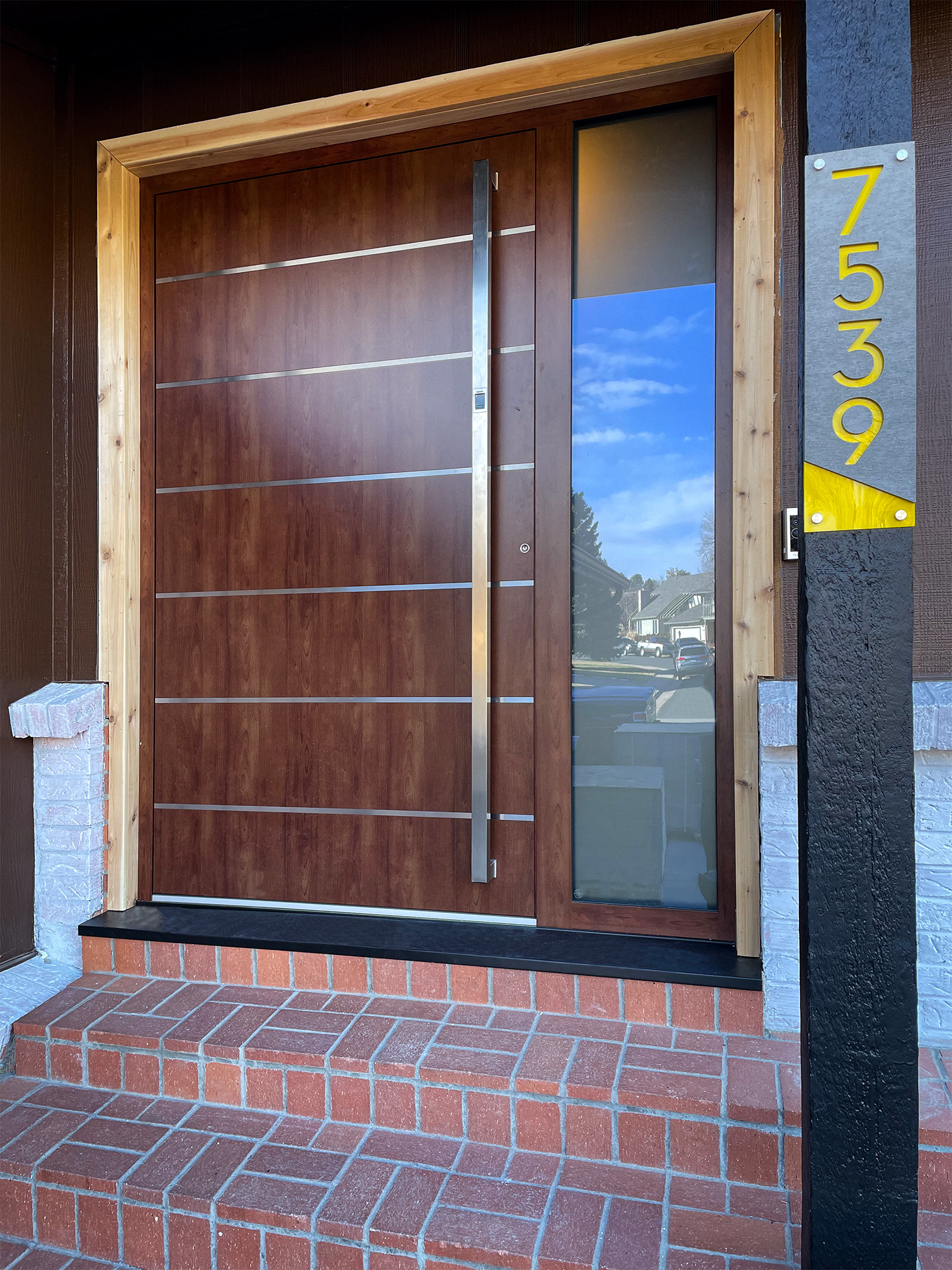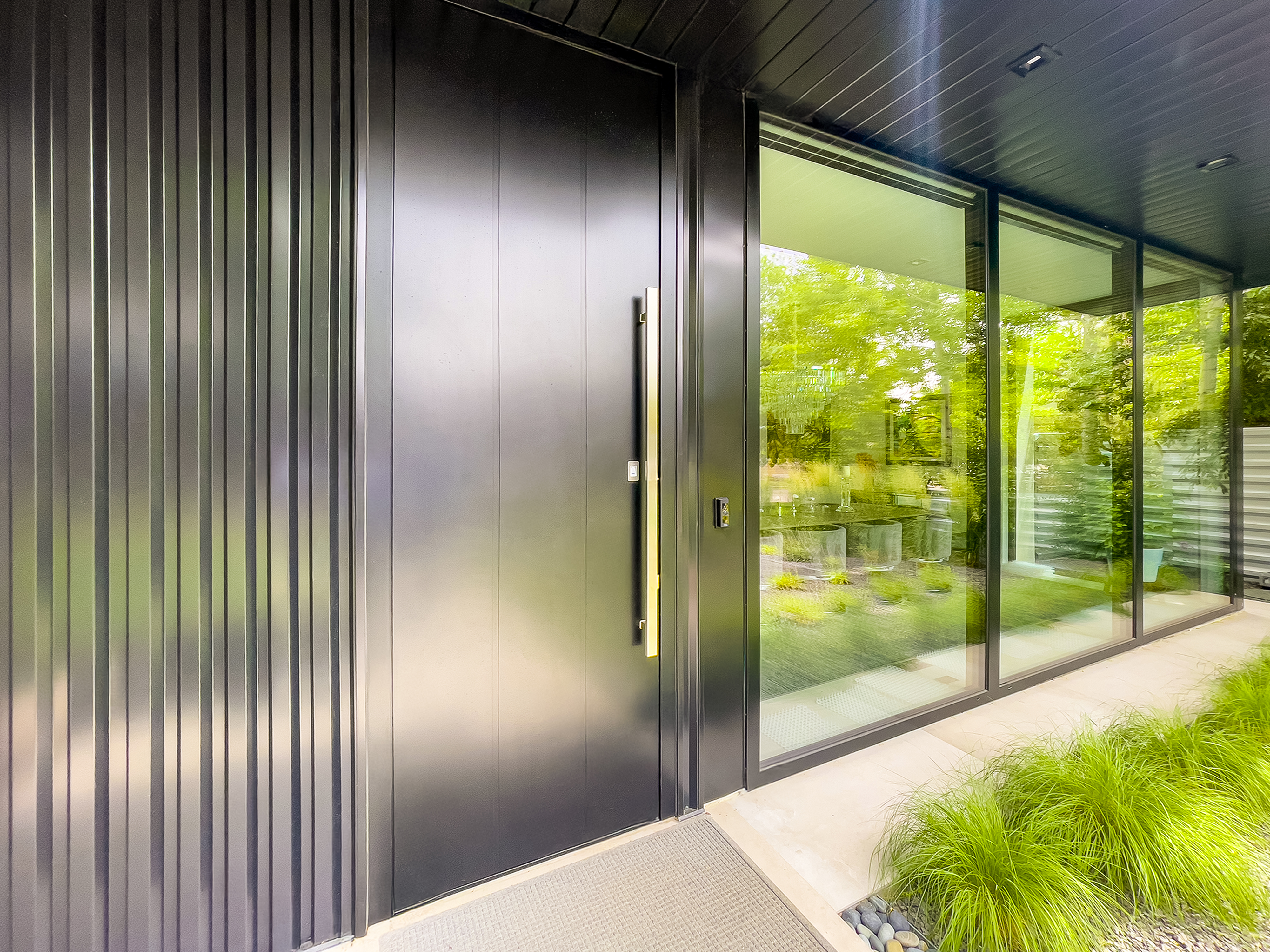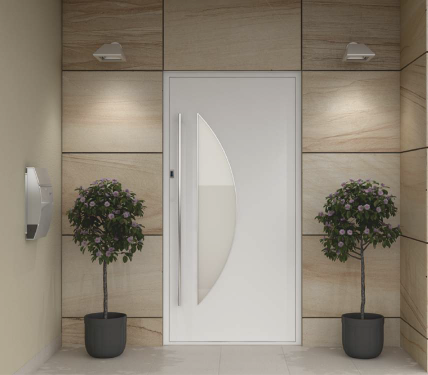- Customizable panel design with stainless steel appliqués and decorative mullions