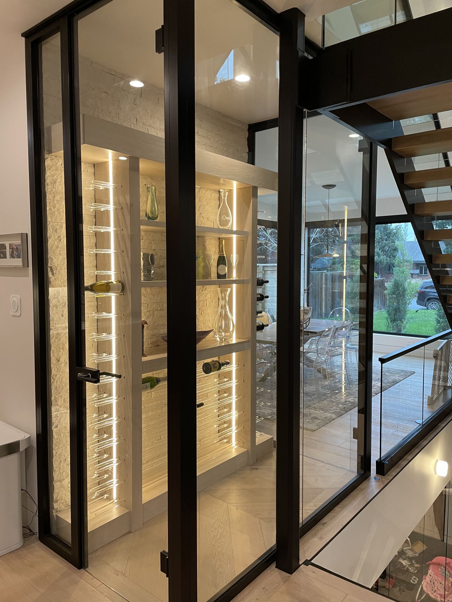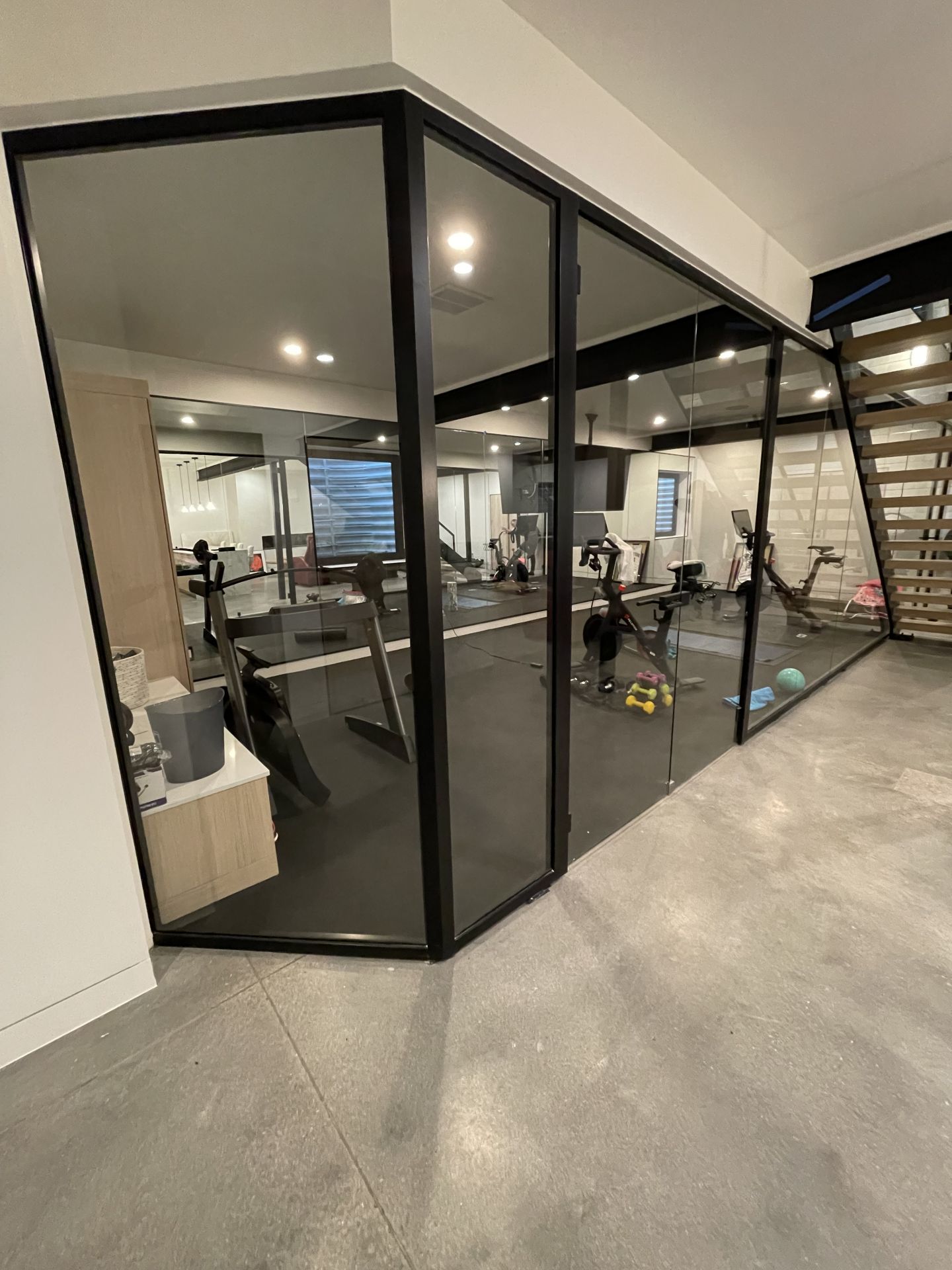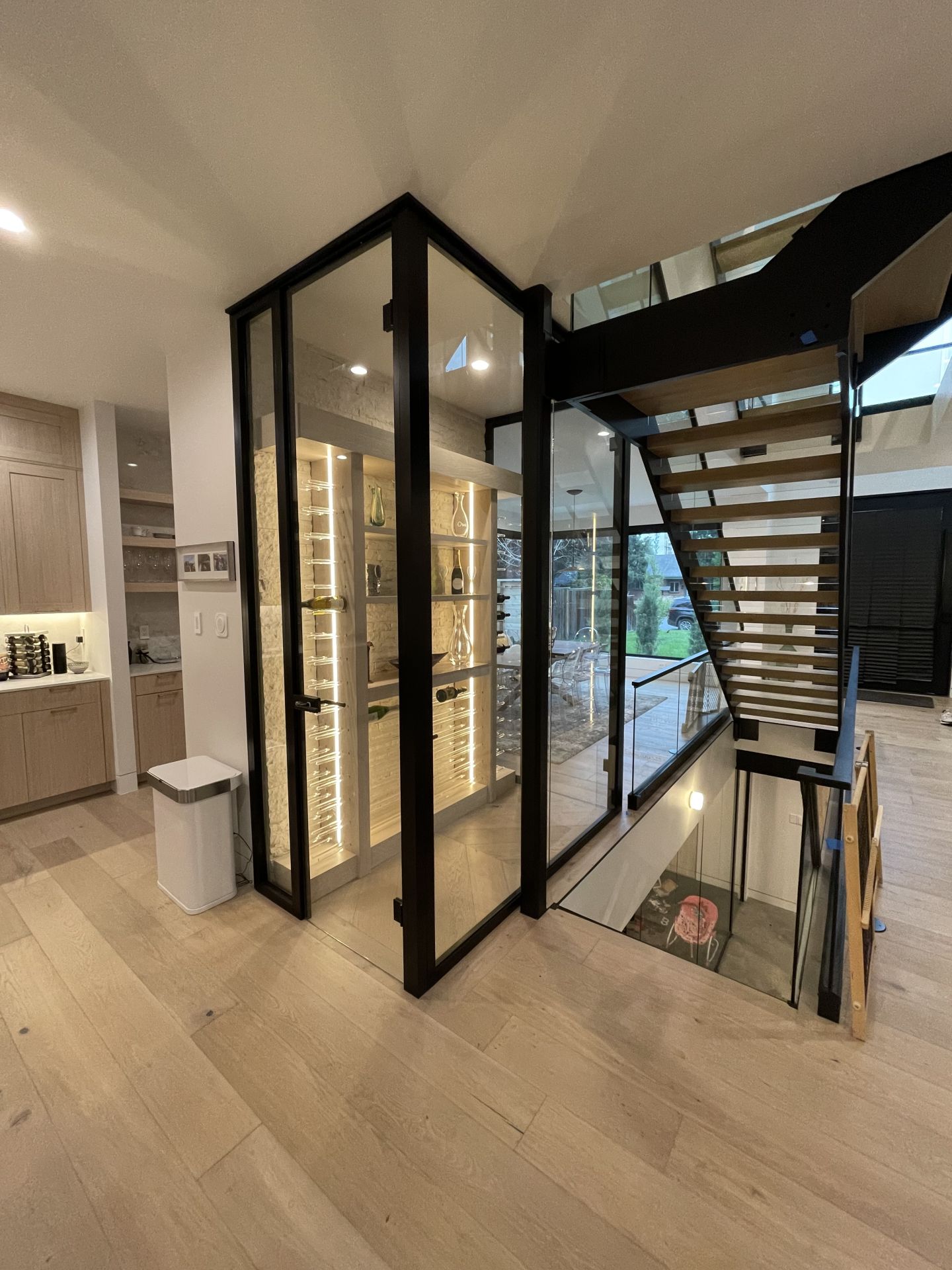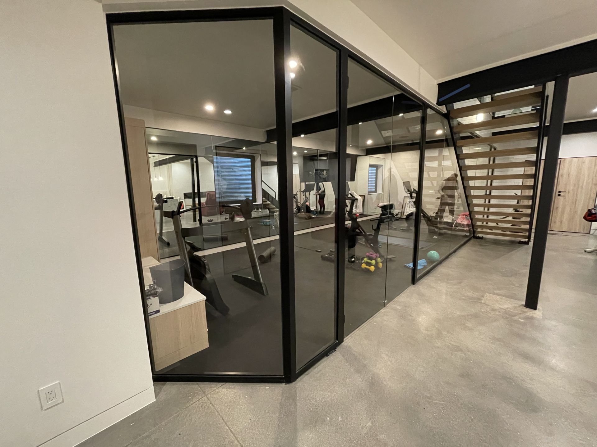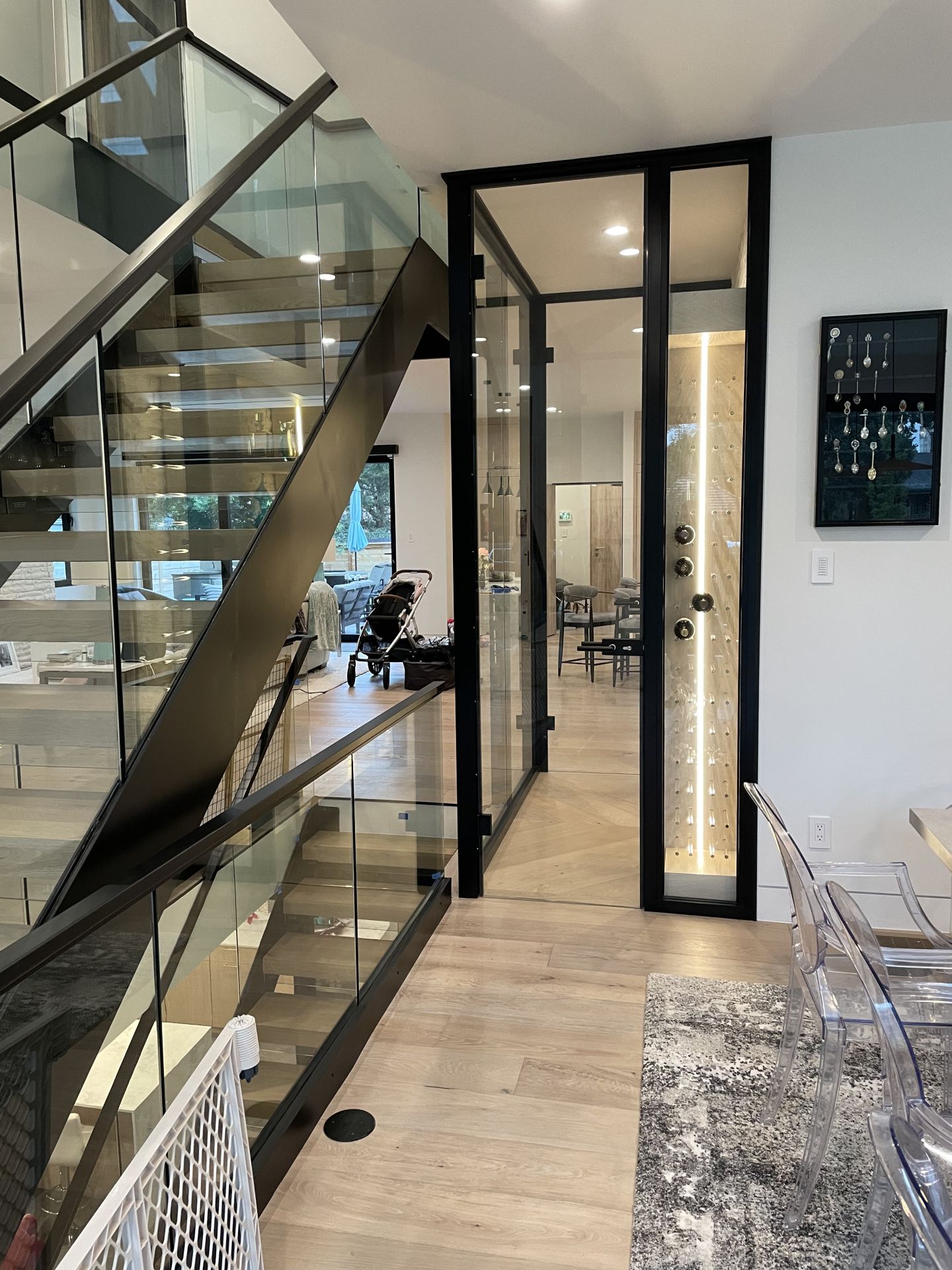 The sleek interior partitions, made of glass with minimal hardware, create an open and airy environment that allows light to travel freely throughout the space. The windows, showcasing a variety of shapes from angular to rectangular, add visual interest while flooding the rooms with natural light. The clean, modern aesthetic is enhanced by high-quality materials and thoughtful attention to detail, which includes fine finishes and well-placed accents. Despite its location in the heart of a bustling city, the home's excellent acoustics provide a tranquil haven, offering residents the perfect retreat from urban noise.