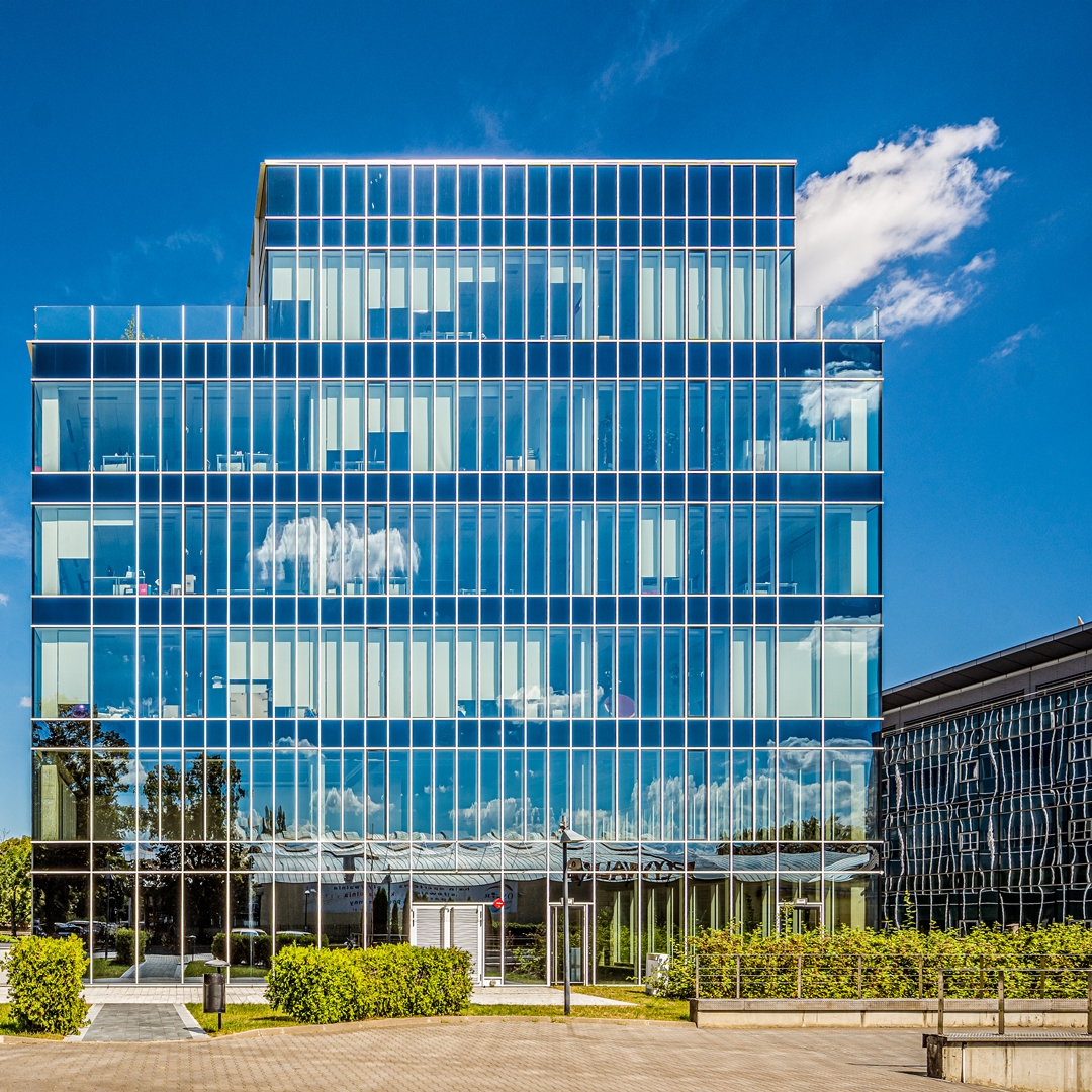 The office building was designed as a cuboidal block with a fully glazed façade, where individual office floors are repetitive and clearly separated from each other. The fully glazed façade ensuring an adequate supply of daylight combined with green terraces guarantees comfort of work for users. The aluminium joinery in the building was made by Alures Sp. z o.o. The project used the top facade system Yawal FA 50N. The large-dimensioned external profiles used in the facade emphasize the geometry of the impressive glazing and, with regular division, the harmony of the shapes.