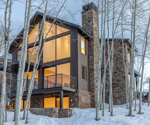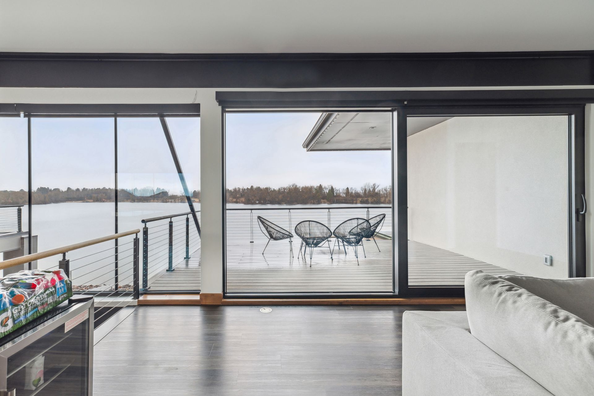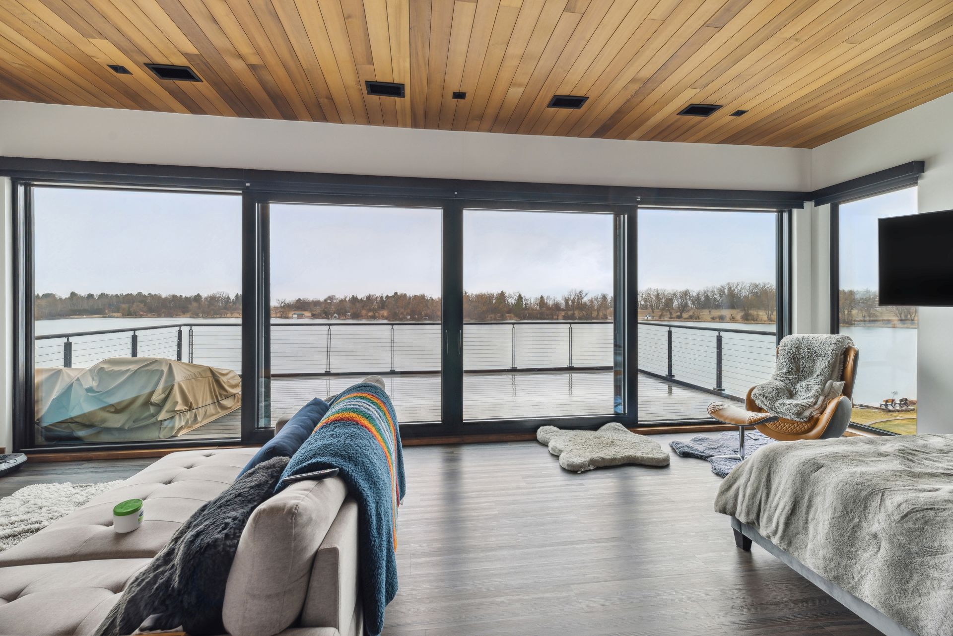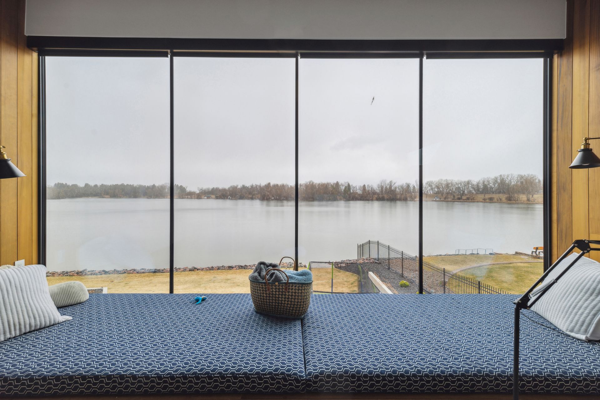 A lakeside haven that perfectly blends with its surroundings, thanks to its oversized windows and doors.