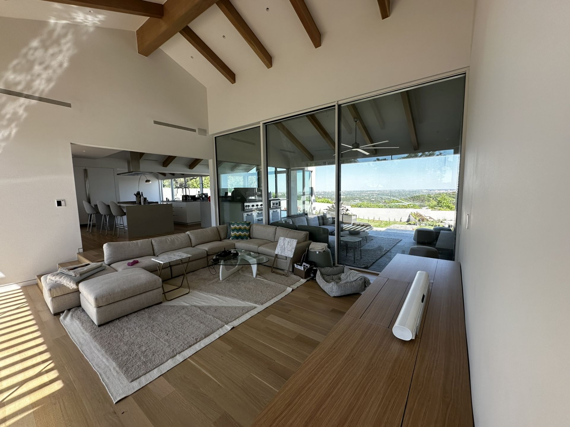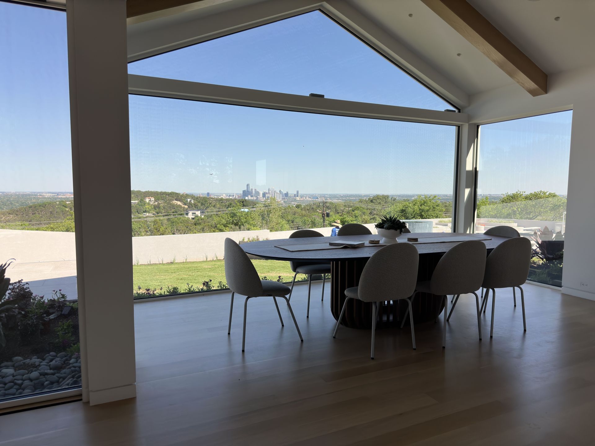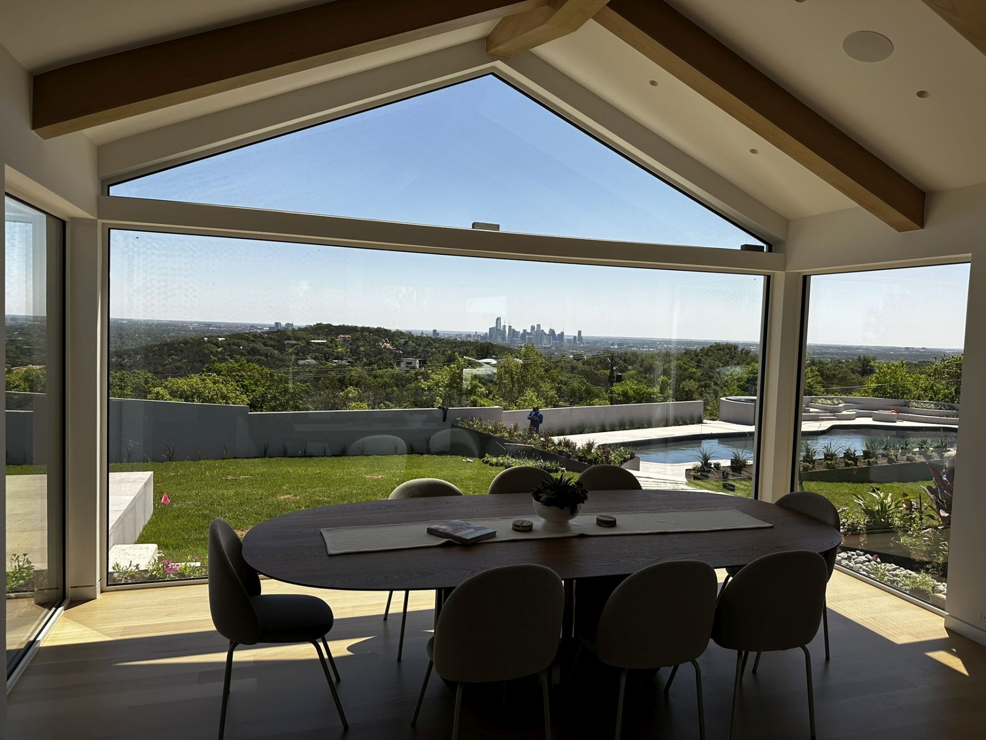 Bathed in abundant natural light, the interior exudes comfort with its airy, open layout and expansive windows that frame breathtaking, unobstructed views of the lush surroundings and cityscape beyond.