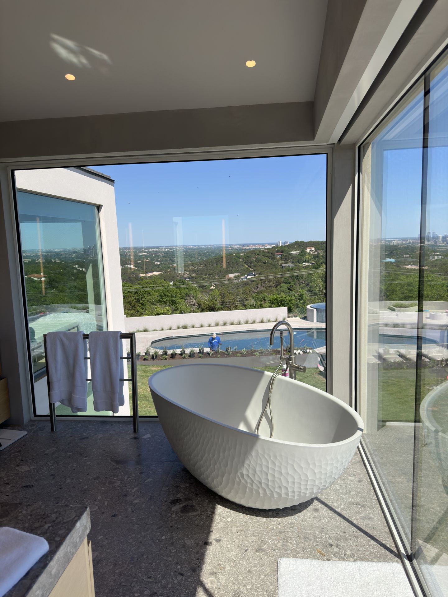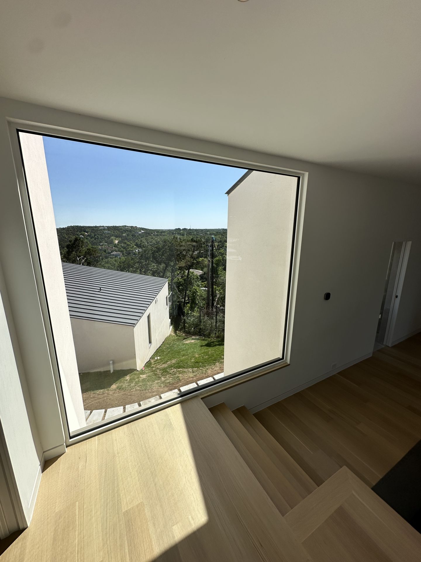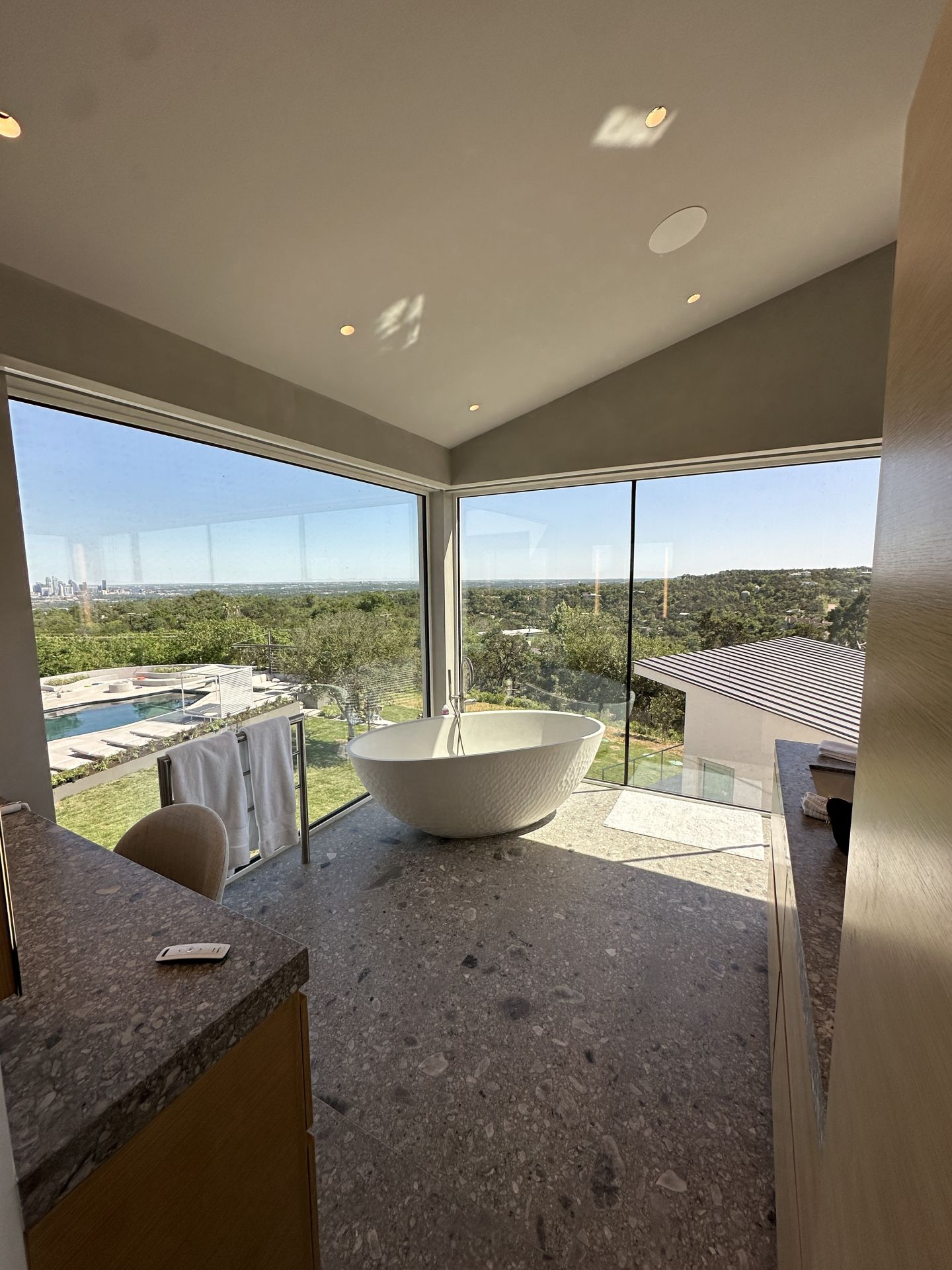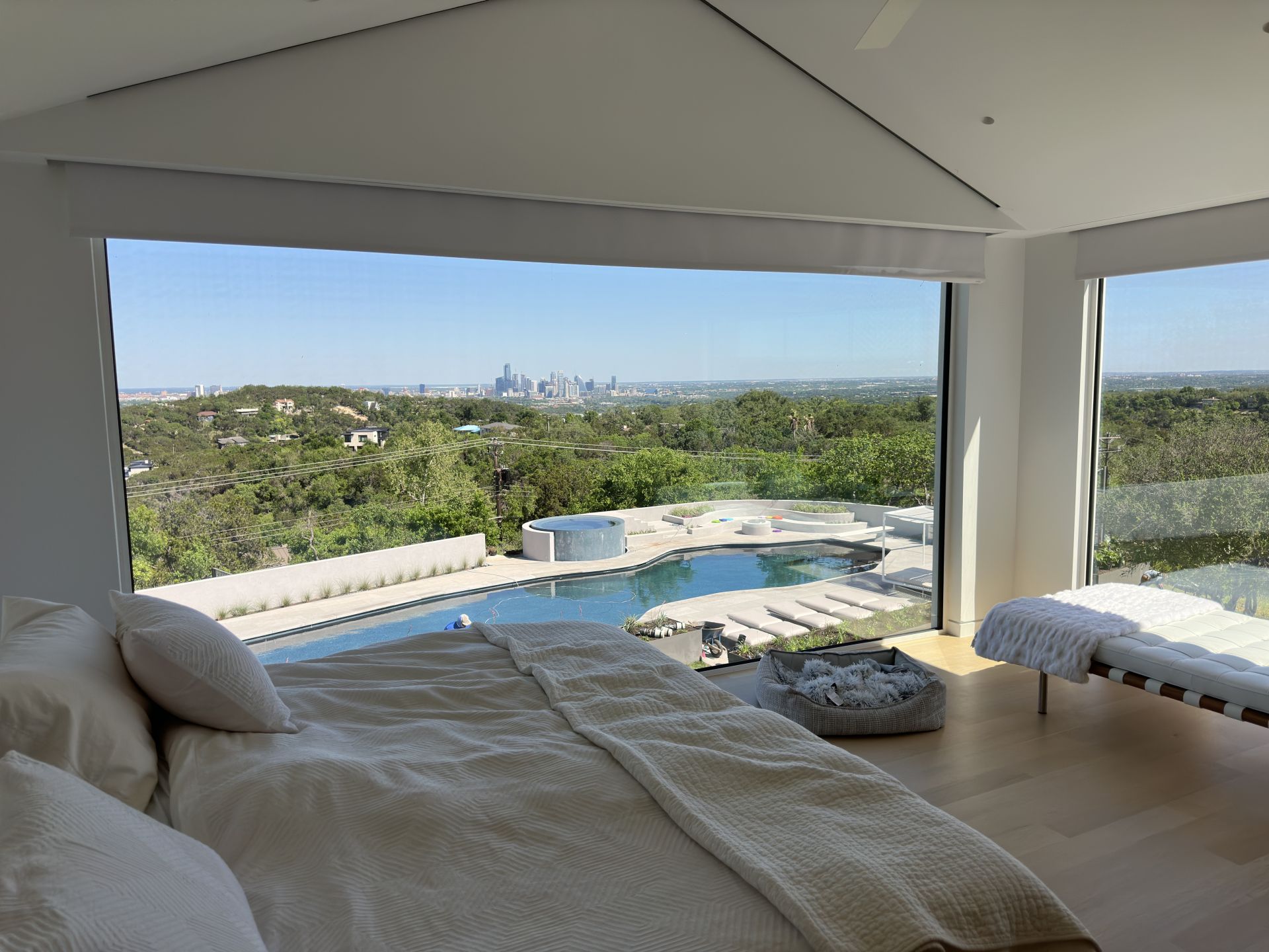 Bathed in abundant natural light, the interior exudes comfort with its airy, open layout and expansive windows that frame breathtaking, unobstructed views of the lush surroundings and cityscape beyond.